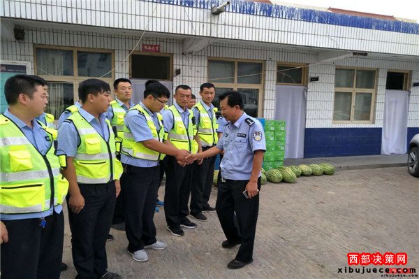 西部決策網(wǎng)訊( 鄒坤 通訊員 崔春月) 時值夏日,天氣持續(xù)高溫,2016年8月10日下午,靖邊縣公安局黨委委員、交警大隊長王世崗、辦公室主任黃瑞峰等一行來到該大隊城區(qū)二中隊慰問在高溫酷熱天氣下堅守崗位的一線民警,深刻表達了大隊黨委對一線民警的關(guān)心和關(guān)愛,并將防暑降溫物品及時送到了一線民警手中。