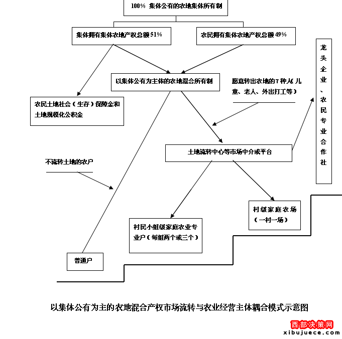 李錄堂向《西部大開發(fā)》介紹,董家?guī)X村示范項(xiàng)目探索建立“以土地集體公有為主,非集體(農(nóng)民)土地所有為輔”的土地集體公有制,通過土地承包經(jīng)營控制權(quán)比例化市場流轉(zhuǎn)試驗(yàn),組建土地股份合作社、家庭農(nóng)場和專業(yè)大戶等經(jīng)營主體,實(shí)行規(guī)模化集約化經(jīng)營,進(jìn)而科學(xué)地解決人多地少條件下土地產(chǎn)權(quán)市場化可能產(chǎn)生的社會(huì)不穩(wěn)定因素以及農(nóng)民農(nóng)地產(chǎn)權(quán)自由進(jìn)入和退出問題,讓農(nóng)民“退出土地”有保障,“進(jìn)入土地”有支持,徹底消除農(nóng)民流轉(zhuǎn)土地的后顧之憂,形成“以公有制為主體具有雙重保障的農(nóng)地市場流轉(zhuǎn)機(jī)制”。這一農(nóng)村土地改革的新思路是遵照“以公有制為主體,多種所有制經(jīng)濟(jì)成分并存”的《憲法》原則,借鑒國有企業(yè)劃分國有股、企業(yè)股和企業(yè)全員持股的經(jīng)驗(yàn)及城鎮(zhèn)住房公積金改革的做法,將農(nóng)地產(chǎn)權(quán)(農(nóng)地承包經(jīng)營使用權(quán)等)在集體和農(nóng)民之間按集體占51%,農(nóng)民占49%的比例混合分配后再市場化流轉(zhuǎn)。其中集體所占農(nóng)地產(chǎn)權(quán)及收益總額的51%主要用于農(nóng)民土地社會(huì)保障金和農(nóng)地規(guī)模化公積金,以解決農(nóng)地市場流轉(zhuǎn)過程中失地失業(yè)農(nóng)民的生存和就業(yè)保障問題,其余49%的收益歸農(nóng)民個(gè)人所有,進(jìn)而形成既能保證農(nóng)地集體所有制主導(dǎo)地位,又具有雙重保障和穩(wěn)定性的農(nóng)地產(chǎn)權(quán)市場流轉(zhuǎn)機(jī)制。