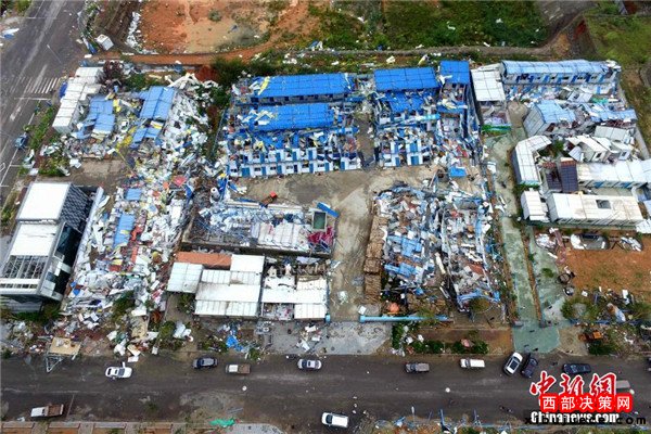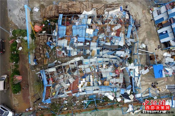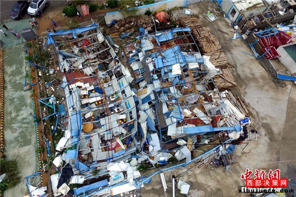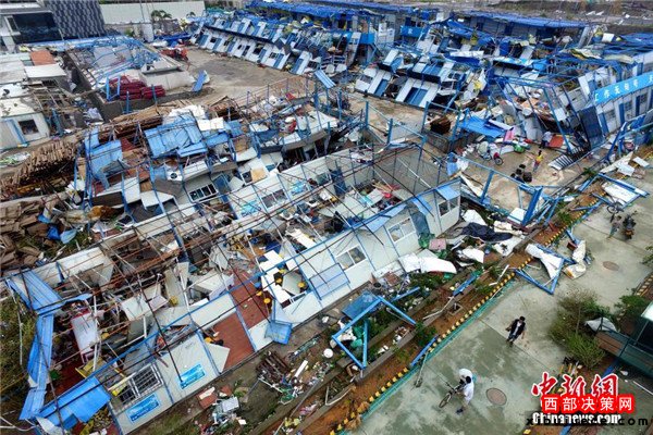9月15日,今年第14號臺風“莫蘭蒂”于凌晨3時05分在廈門翔安沿海登陸,登陸時中心附近最大風力15級(48米/秒,強臺風級),中心氣壓945百帕。圖為航拍登陸點翔安一工地工棚被完全摧毀。