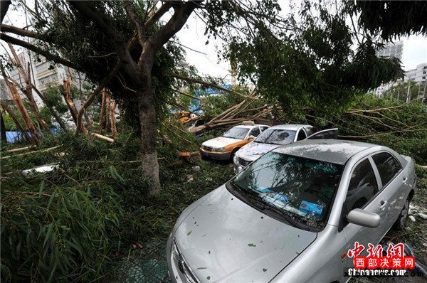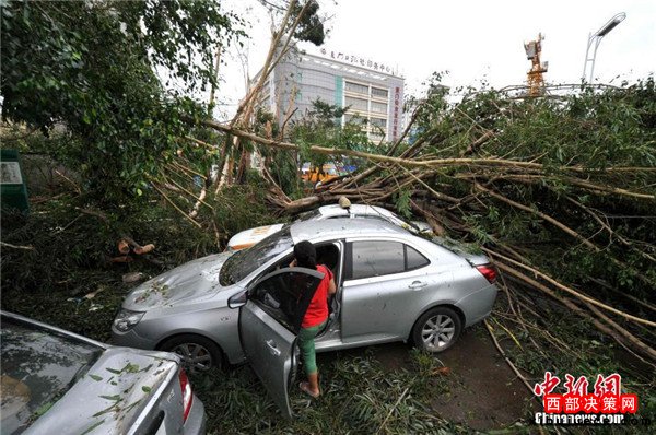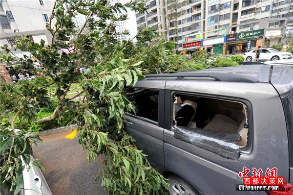 9月15日,今年第14號臺風“莫蘭蒂”于凌晨3時05分在廈門翔安沿海登陸,登陸時中心附近最大風力15級(48米/秒,強臺風級),中心氣壓945百帕。圖為廈門市區(qū)大批車輛被吹倒的樹木損壞。