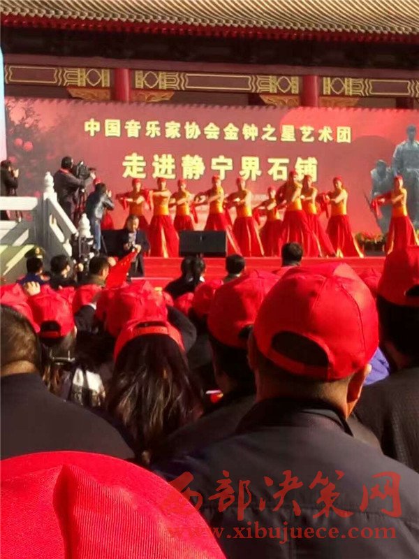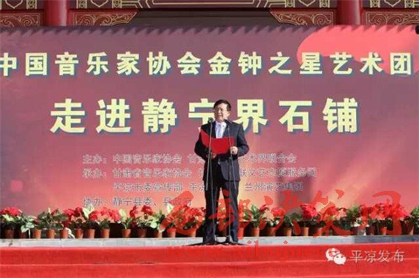 11月3日,在全國上下認(rèn)真學(xué)習(xí)貫徹黨的十八屆六中全會精神、隆重紀(jì)念紅軍長征勝利80周年之際,由中國音樂家協(xié)會、甘肅省文聯(lián)主辦,甘肅省音樂家協(xié)會、甘肅省文聯(lián)文藝志愿者服務(wù)團、平?jīng)鍪形麄鞑?、平?jīng)鍪形穆?lián)承辦,靜寧縣委、縣政府協(xié)辦的“長征精神代代傳——中國音協(xié)金鐘之星藝術(shù)團‘送歡樂·下基層’慰問演出活動”在靜寧縣界石鋪紅軍長征毛澤東舊居紀(jì)念館演出。