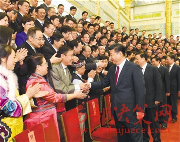 上午9時30分,習近平等來到人民大會堂金色大廳,同代表們親切握手,并合影留念。