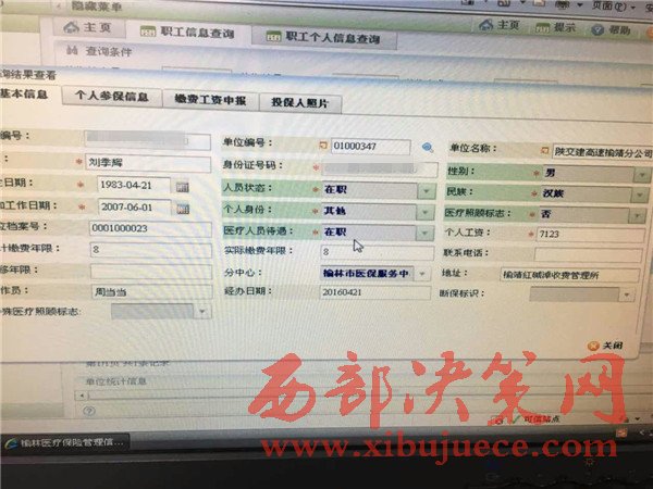 為了進(jìn)一步了解到底是陜西省交通集團(tuán)榆靖分公司紀(jì)委部造假還是陜蒙界收費(fèi)站職工(提供的考勤表上有明顯涂改痕跡,天數(shù)是28天)和站長(zhǎng)自己(自敘錄音)一起造假。在合療辦調(diào)取查看的合療系統(tǒng)顯示,單位編號(hào)01000347,名稱陜交建高速榆靖分公司,劉某工資7123元。