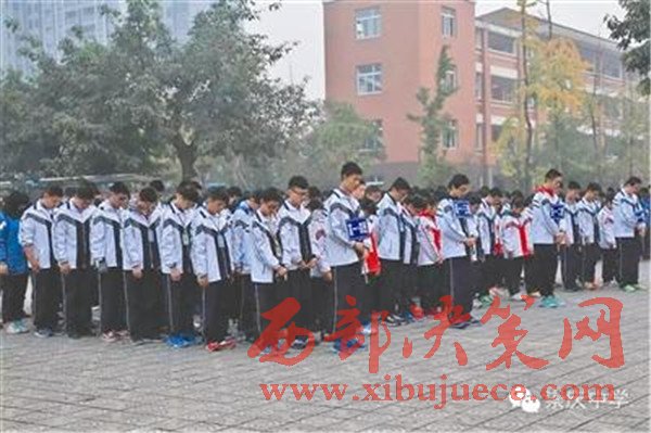 在晨霧中,崇慶中學(xué)的師生們?yōu)橛嘈衲В昼姾?,同學(xué)們走向敬賢樓,向余旭的遺像獻(xiàn)花。在一米多高的照片中,余旭一身戎裝,神采飛揚(yáng)。