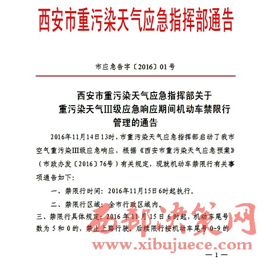 記者從西安市重污染天氣應(yīng)急指揮部了解到,2016年11月14日13時,西安市重污染天氣應(yīng)急指揮部啟動了西安市空氣重污染Ⅲ級應(yīng)急響應(yīng)。根據(jù)《西安市重污染天氣應(yīng)急預(yù)案》(市政辦發(fā)〔2016〕76號)有關(guān)規(guī)定,現(xiàn)就機(jī)動車禁限行有關(guān)事項通告如下: