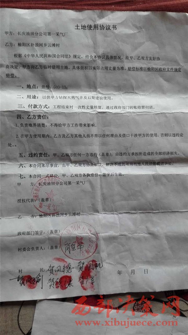 日前,陜西榆林榆陽區(qū)補浪河一村民反映,長慶油田采氣一廠在他們村征地鉆探天然氣井,村民懷疑長慶采氣一廠和他們村委會簽定的《土地使用協(xié)議書》存在著嚴重的問題。村民向記者看了一份所謂的巜土地使用協(xié)議書》,記者看到這份漏洞百出的協(xié)議書,協(xié)議書的甲方是長慶油田采氣一廠分公司,而協(xié)議書公章是中國石油天然氣長慶股份有限公司(……)分公司,幾個關鍵的字根本看不清楚,不知道這個沒有蓋清楚公章的協(xié)議書到底想掩蓋什么?還是這枚公章就是一枚假公章。協(xié)議書的甲方名稱為什么和公章名稱不符呢?