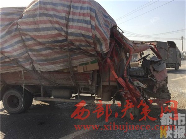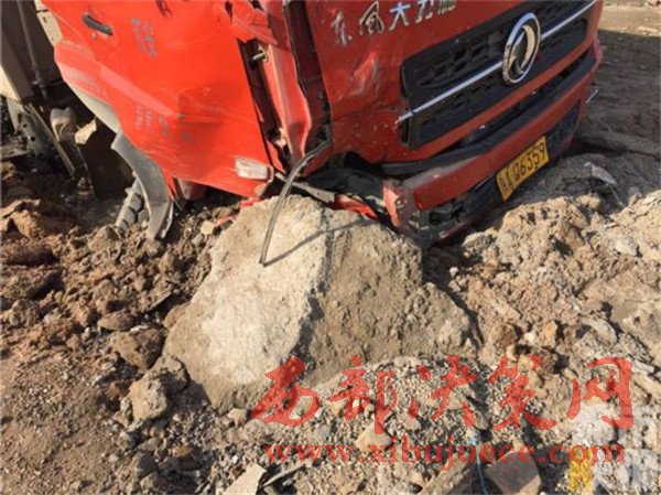 記者在事發(fā)地108國道西安市戶縣境內(nèi)看到,被撞的小貨車已經(jīng)面部全非,前部完全破損。而在這邊一輛拉沙車已經(jīng)沖到了路基下,發(fā)生傾斜。