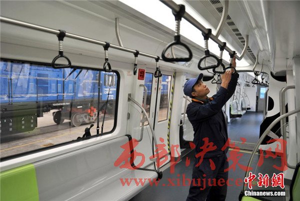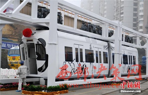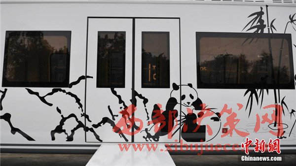 記者在現(xiàn)場(chǎng)看到,正式下線(xiàn)的空鐵車(chē)身為卡通熊貓山水圖案,酷似“熊貓”,每列定員144人,時(shí)速最高可達(dá)65公里。列車(chē)采用“大容量動(dòng)力蓄電池充放電控制技術(shù)”,通過(guò)實(shí)現(xiàn)高倍率放電,提高列車(chē)起動(dòng)加速性能及對(duì)極限環(huán)境的適應(yīng)性,同時(shí)能將400千瓦的電制動(dòng)功率全部用于動(dòng)力電池快速充電,實(shí)現(xiàn)制動(dòng)能量回收再利用,延長(zhǎng)蓄電池續(xù)航里程達(dá)120千米。圖為車(chē)身外繪制有熊貓山水圖案。