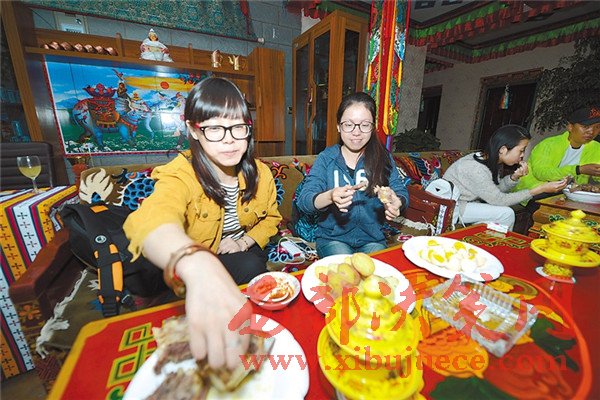 圖為來自內(nèi)地的游客正在品嘗特色藏餐。