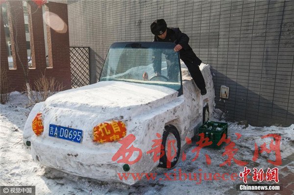 1月3日,吉林省長(zhǎng)春市,六旬保安組團(tuán)建雪雕汽車,上車下車用啤酒箱當(dāng)踏板。