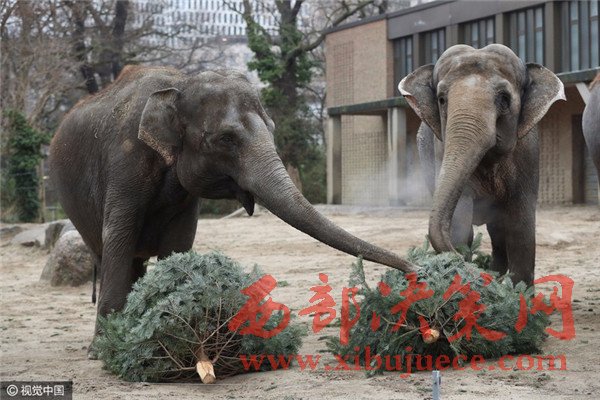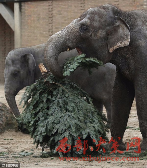 當(dāng)?shù)貢r(shí)間2017年1月3日,德國柏林,Zoologischer Garten動(dòng)物園的大象們食用“圣誕樹”美食大餐。