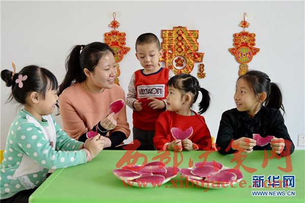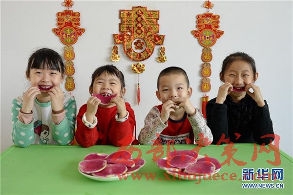 2月3日,河北省邢臺市橋東區(qū)三義廟社區(qū)的兒童在社區(qū)兒童娛樂室吃蘿卜“咬春”。