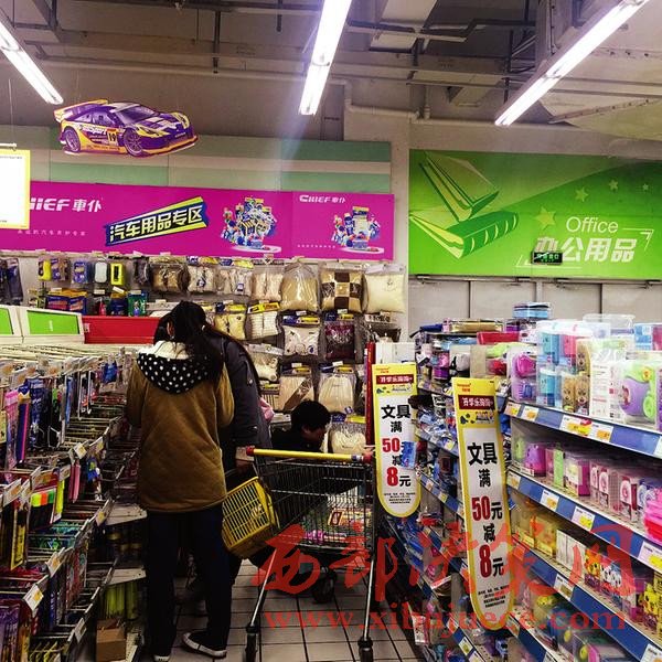 昨日記者在和平門外一超市二樓看到,入口處擺滿了本子、文具盒、書包等學(xué)習(xí)用具,“開學(xué)樂淘淘”的宣傳海報(bào)有“買50元,減8元”的優(yōu)惠活動。