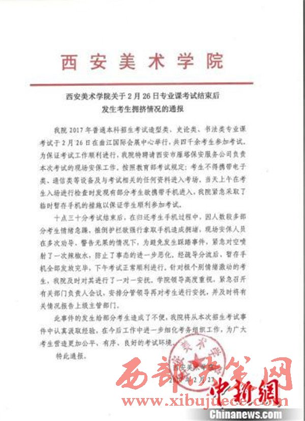 西安美術(shù)學院發(fā)布的事件通報稱,考試結(jié)束后,在歸還手機過程中,因人數(shù)較多部分考生情緒急躁,推倒護欄欲強行拿取手機造成擁堵,現(xiàn)場安保人員在多次勸導、警告無果的情況下,為避免發(fā)生踩踏時間,緊急對空噴射了一次辣椒水,防止了事態(tài)的進一步惡化。經(jīng)疏導分流后,暫存手機全部發(fā)放完畢,下午考試順利進行。針對個別情緒激動的考生,該院即使對其進行了一對一安撫。學院領導高度重視,緊急召開有關部門負責人會議,安排分管領導再對考生進行安撫,并及時將有關情況報告上級主管部門。此事件的發(fā)生給部分考生造成了不便,該院將從本次招生考試事件中認真汲取經(jīng)驗,在今后工作中進一步細化考務組織工作,為廣大考生營造更加公平、有序、良好的考試環(huán)境。