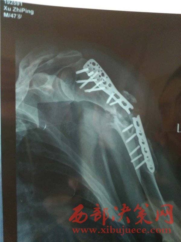 在當(dāng)時(shí)的手術(shù)當(dāng)中院方告知患者手術(shù)中采用的是鈦合金鋼板,當(dāng)時(shí)的報(bào)價(jià)為15800元,術(shù)后未發(fā)現(xiàn)什么異常故住院18天后出院。時(shí)隔1年半到2016年年底,來(lái)到榆林星元醫(yī)院準(zhǔn)備拆鋼板時(shí),通過(guò)XT片后發(fā)現(xiàn)鋼板是斷裂的,固定鋼板的13個(gè)鋼釘也全部斷裂,肱骨也未長(zhǎng)好,所以不得不再進(jìn)行二次手術(shù),將原來(lái)的鋼板拆除,再做一次手術(shù),再一次將19個(gè)鋼釘打在了自己的左胳膊上。