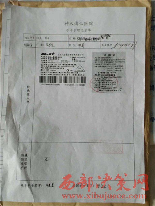 患者家屬將原來(lái)在博仁醫(yī)院住院的資料全部拿出來(lái)時(shí)發(fā)現(xiàn),大保當(dāng)博仁醫(yī)院當(dāng)時(shí)給患者做手術(shù)所用的鋼板可能存在問(wèn)題,做手術(shù)所用的鋼板與當(dāng)時(shí)給患者提供的合格證書(shū)不符,在此期間家屬也找過(guò)原博仁醫(yī)院劉院長(zhǎng),所給的答復(fù)是他剛來(lái)不知道此事,董事長(zhǎng)(賀玉剛)也說(shuō)是在西安,你們先看病,回頭把鋼板拿過(guò)來(lái),等鋼板廠(chǎng)家的人來(lái)了,我們?nèi)阶谝黄鹂丛趺唇鉀Q,就這樣一直拖著直到現(xiàn)在。