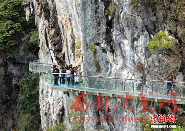 3月24日,地處廣西融安縣石門仙湖景區(qū)的玻璃棧道試運行,數(shù)十名游客體驗“嘗鮮”。該玻璃棧道建在距離谷底達(dá)60米的懸崖壁上,下方是石門仙湖山石峻峭的中天坑,全長309.4米、寬1.6米,是目前廣西最長的玻璃棧道。