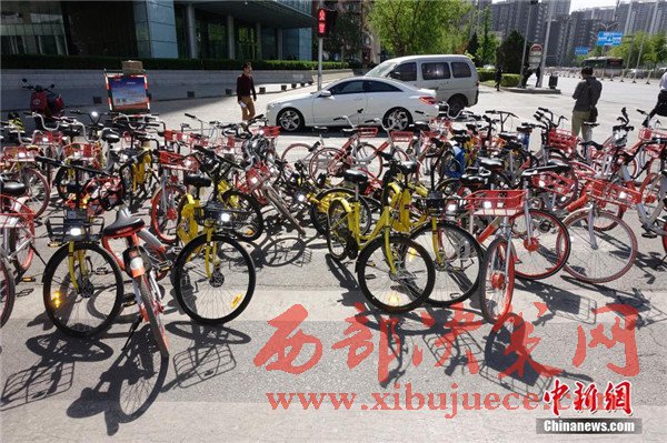 一輛私家車被各家公司、不同顏色的“共享單車”層層包圍。