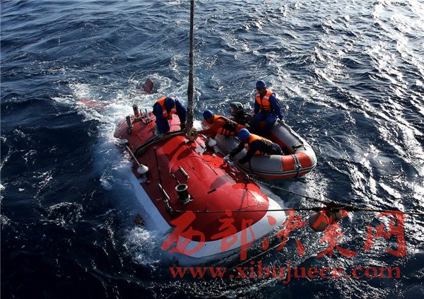 5月10日,“蛙人”系纜,“蛟龍”號完成下潛準備回到船上甲板。