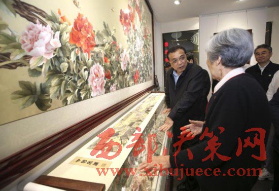 李克強2017年5月8日晚來到開封七盛角民俗文化街,在王素花汴繡館長時間駐足。82歲的王素花多年繼承創(chuàng)新宋代傳統(tǒng)刺繡工藝,是汴繡領(lǐng)軍人物??偫碜屑氂^賞后稱贊她用色“多而不雜”,技藝“爐火純青”。