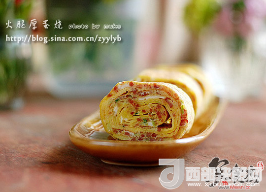 7.重復(fù)第6步驟,直到蛋液全部用完(每次倒蛋液的時候,都攪拌一下,不要讓火腿末等沉在碗底,鍋子不粘效果好的話,只需要開始時抹一次油即可,覺得粘的話,中途也可以抹油)。
