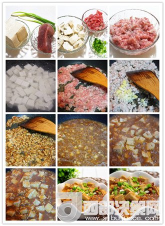 第二步:將豆腐切成小塊、豬肉剁成末、香蔥切碎、蔥姜蒜切末備用。