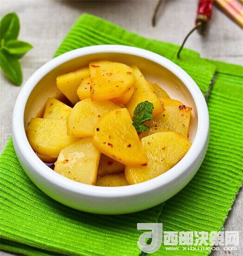 6.將調料澆入土豆片即可,其實這個菜還有一個做法,可以將調料中加上高湯和復合調料油,將土豆片浸泡,味道更加美,家庭操作通常以簡單易行為好。