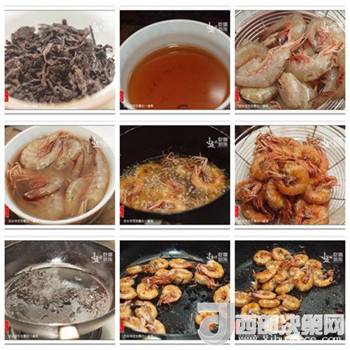 準(zhǔn)備好烏龍茶;加入開水沖泡,第一泡茶水倒掉,其他的茶水沖在碗里,茶葉瀝干水分待用;海蝦去除蝦頭,蝦背剪開;將蝦放入茶水中,浸泡1個(gè)小時(shí),撈出瀝干水分;熱油,下蝦,用中火炸至蝦金黃;取出,再快速?gòu)?fù)炸一遍,瀝干油;取一平底鍋,下1湯匙左右的油,溫度足夠時(shí),下茶葉,用中小火炒出茶葉的香味;下蝦,繼續(xù)用中小火炒均勻,炒至蝦變熱;加入椒鹽粉調(diào)味,即可熄火。