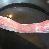 5. 把五花肉放進(jìn)鍋中,小火煸炒至出油,兩面金黃。