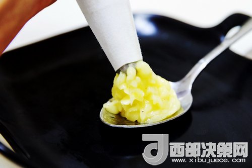 調(diào)好的土豆泥裝進(jìn)裱花袋,擠出成型。