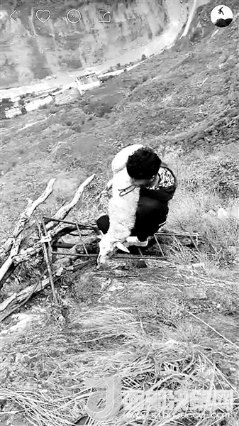 現(xiàn)在,村里24歲的彝族小伙兒拉博已經(jīng)成為首批網(wǎng)紅之一。2016年11月19日,垂直距離約800米、總共約1000級臺階的懸崖村鋼梯工程竣工。拉博就是鋼梯施工隊的一員,在山崖最陡峭的一段,他親手打下了固定的鋼釘。鋼梯完工后,拉博特意去“跑”了一遍,從山頂?shù)缴侥_僅耗時18分鐘,而這段路普通人可能需要一個半小時。從小放羊的拉博習慣了在山間奔跑跳躍,爬天梯、過吊橋、放牛羊這些生活日常,在5個月的時間里為他帶來了12.6萬的粉絲。