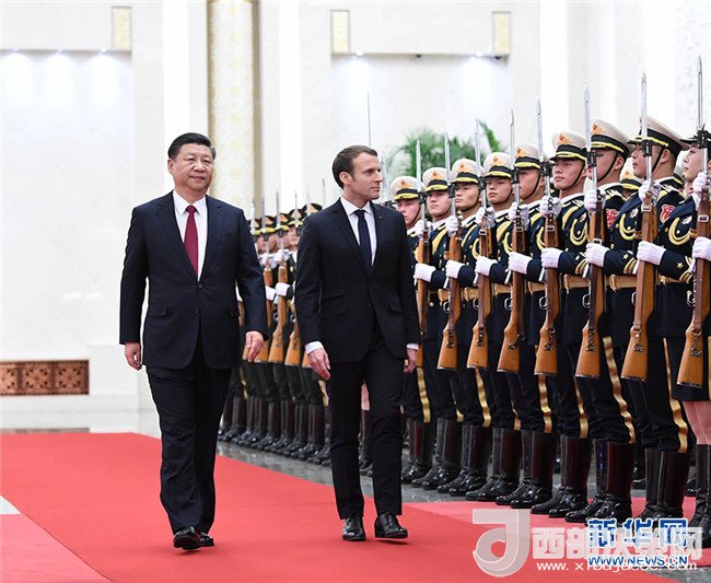 會(huì)談前,習(xí)近平在人民大會(huì)堂北大廳為馬克龍舉行歡迎儀式。習(xí)近平主席夫人彭麗媛,中共中央政治局委員、國(guó)務(wù)委員楊潔篪,全國(guó)人大常委會(huì)副委員長(zhǎng)陳竺,全國(guó)政協(xié)副主席林文漪等參加。(記者白潔 許可 王卓倫)