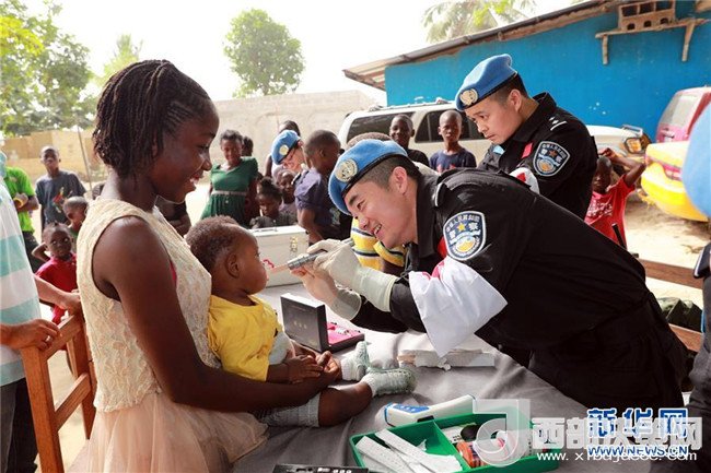 2017年12月28日,在利比里亞蒙羅維亞,中國維和警察防暴隊醫(yī)療人員為兒童做口腔檢查。當(dāng)日,中國第五支駐利比里亞維和警察防暴隊派出醫(yī)護(hù)人員前往蒙羅維亞市本森威爾社區(qū)孤兒院,為兒童和員工進(jìn)行義診。(趙小新攝)