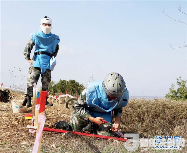 2017年11月8日,在黎巴嫩南部黎以邊境“藍(lán)線”附近的掃雷作業(yè)點,中國工兵新作業(yè)手在組長的指導(dǎo)下進(jìn)行掃雷作業(yè)。2017年10月初,中國維和部隊接到聯(lián)合國駐黎巴嫩臨時部隊(聯(lián)黎部隊)任務(wù),要求清排一片面積超過1萬平方米、埋有千余枚防步兵地雷的雷場。(董永康攝)