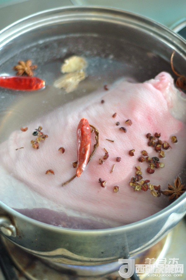 1.肘子冷水下鍋,水里放入干辣椒、花椒、大料、姜片,煮至水開(kāi)