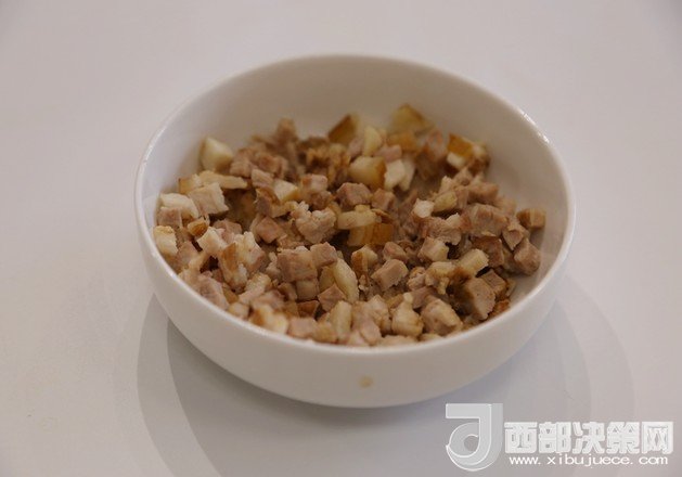 2.將蘿卜干切成小顆粒狀,鹽菜也切碎一點。