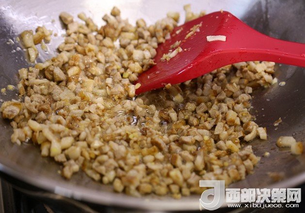 11.加入鹽菜和蘿卜干翻炒,加入適量生抽翻炒均勻。