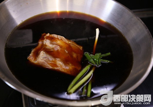 4.鍋里加入適量水,放入蔥結(jié),加入適量老抽,放入五花肉煮半小時左右。