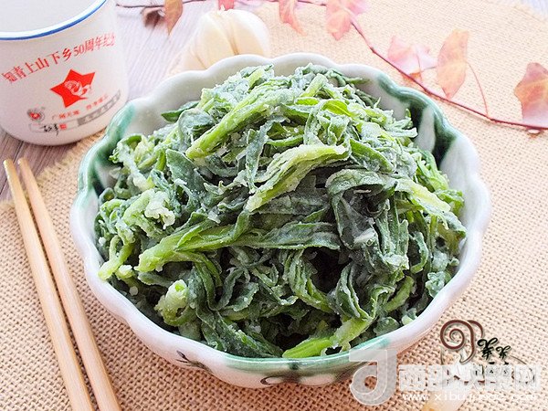 2.放入玉米淀粉和面粉,二者比例1:1,抓勻,使每片菜葉都裹上一層薄薄的粉,不用質(zhì)疑我為什么用一半的玉米淀粉,這樣做,蒸出來(lái)的菜口感好、顏色漂亮,不信您試試