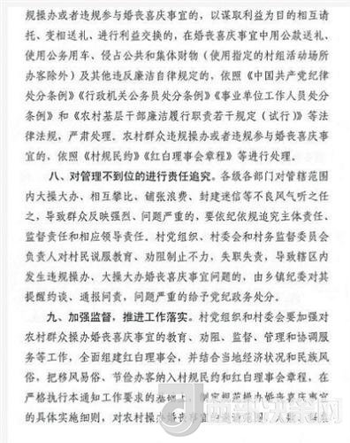 各級(jí)各部門(mén)對(duì)管轄范圍內(nèi)大操大辦、相互攀比、鋪張浪費(fèi)、封建迷信等不良風(fēng)氣聽(tīng)之任之,導(dǎo)致群眾反映強(qiáng)烈、問(wèn)題嚴(yán)重的,要依紀(jì)依規(guī)追究主體責(zé)任、監(jiān)督責(zé)任和相應(yīng)領(lǐng)導(dǎo)責(zé)任。村黨組織、村委會(huì)和村務(wù)監(jiān)督委員會(huì)負(fù)責(zé)人對(duì)村民說(shuō)服教育、勸阻制止不力,失職失責(zé),導(dǎo)致轄區(qū)內(nèi)發(fā)生違規(guī)操辦、大操大辦婚喪喜慶事宜問(wèn)題的,由鄉(xiāng)鎮(zhèn)紀(jì)委對(duì)其提醒約談、通報(bào)問(wèn)責(zé),問(wèn)題嚴(yán)重的給予黨紀(jì)政務(wù)處分。