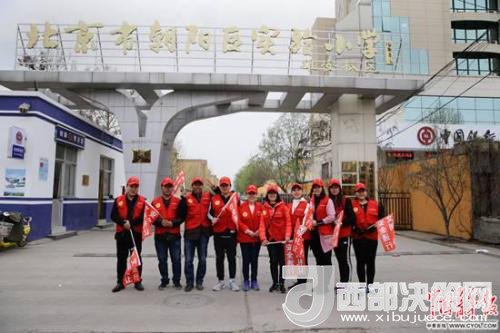 北京市朝陽區(qū)實驗小學雄安校區(qū),參加“家校警”護學隊的當?shù)丶议L志愿者在校門口。