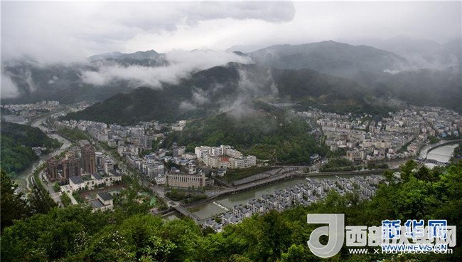 汶川地震后在原址上重建的新青川縣城(4月25日無人機(jī)拍攝)。新華社記者陶明攝