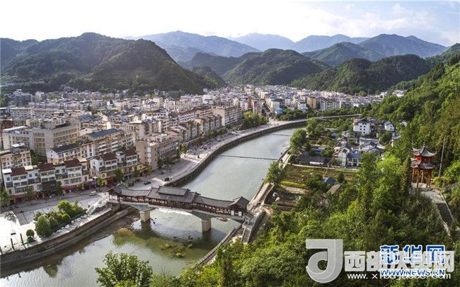 新青川縣城喬莊河上興建的感恩廊橋(4月25日無人機(jī)拍攝)。新華社記者陶明攝