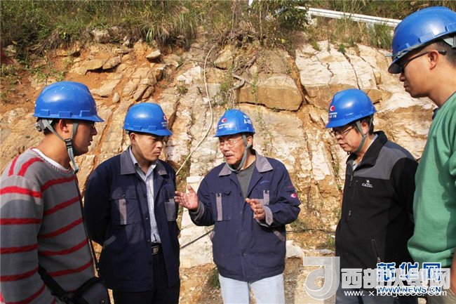 南仁東(左三)與工程技術(shù)人員在大窩凼施工現(xiàn)場(chǎng)檢查施工進(jìn)展(2014年12月1日攝)。