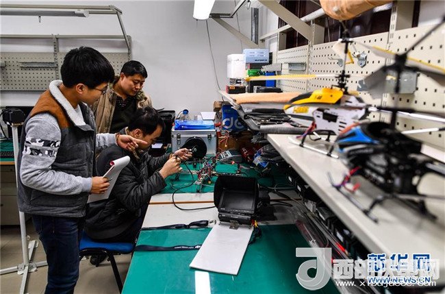 黃大年團(tuán)隊(duì)成員在實(shí)驗(yàn)室內(nèi)調(diào)試、組裝無人機(jī)(2017年2月9日攝)。