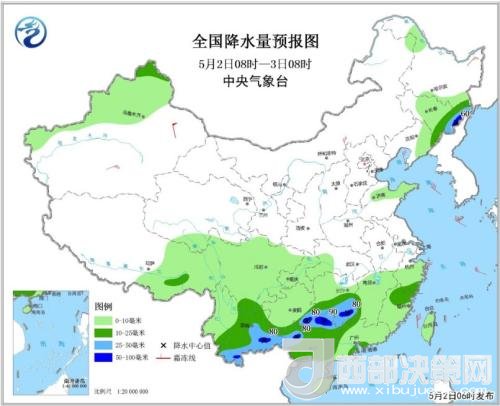 5月2日08時至3日08時,吉林東部、湖南南部、貴州南部、廣西大部、云南南部等地的部分地區(qū)有中到大雨,其中,吉林東部、湖南南部、貴州東南部、廣西北部和西部、云南南部等地局地有暴雨(50~90毫米);上述局部地區(qū)將伴有短時強降水等強對流天氣。新疆北部和南疆盆地東部、內蒙古中西部、遼東半島等地有4~6級風;新疆南疆盆地等地的部分地區(qū)有揚沙或浮塵天氣(見圖1)。