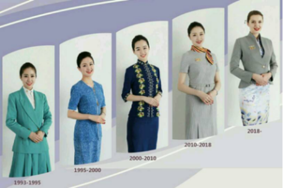 歲月變遷,以優(yōu)質服務贏得客戶青睞的初心不改。圖為海航空乘人員的五代服裝,反應了時代的變化。