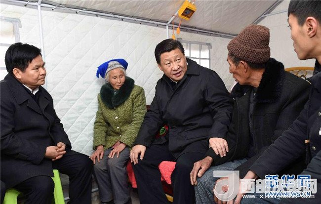 2015年1月19日至21日,中共中央總書記、國家主席、中央軍委主席習近平來到云南昭通、大理、昆明等地,看望魯?shù)榈卣馂膮^(qū)干部群眾,深入企業(yè)、工地、鄉(xiāng)村考察,就災后恢復重建和經(jīng)濟社會發(fā)展情況進行調研。這是1月19日,習近平來到魯?shù)榭h小寨鎮(zhèn)甘家寨紅旗社區(qū)過渡安置點,走進鄒體富老兩口和孫子住的帳篷,詢問家里吃飯、補助、收入等問題。新華社記者 張鐸 攝