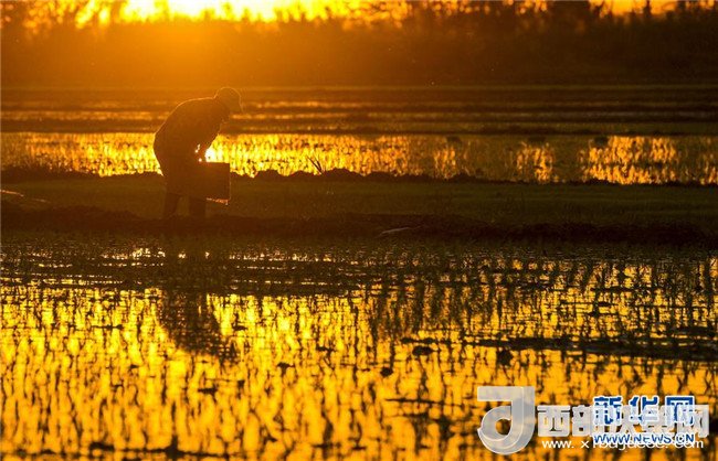 夕陽西下,村民在新疆察布查爾錫伯自治縣種羊場托海依村的一處農(nóng)田里勞動(5月21日攝)。近日,隨著氣溫漸高,地處新疆伊犁河谷的察布查爾錫伯自治縣迎來插秧高峰期,田間地頭一派繁忙景象。塊塊稻田水滿如鏡,田間防護林枝繁葉茂,遠處雪山依稀可見,如一幅在大地上鋪展開的生態(tài)畫卷。新華社記者胡虎虎攝