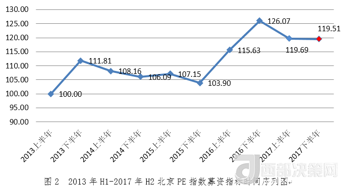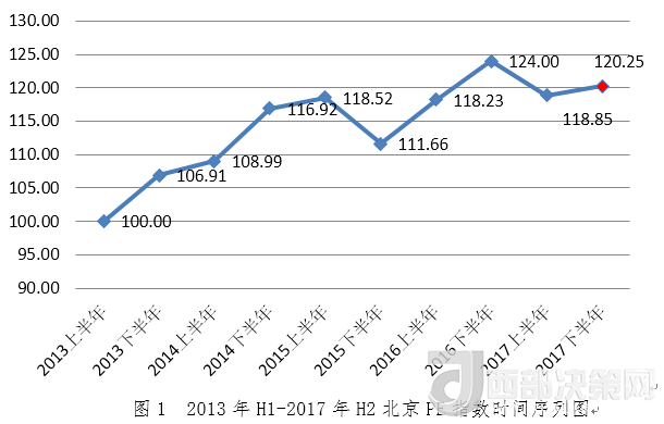 2017年下半年北京PE指數(shù)為120.25,環(huán)比增長1.18%,同比下降3.03%。從指數(shù)走勢(shì)看,2017年下半年北京PE指數(shù)較上半年穩(wěn)步回升,仍處于高位。